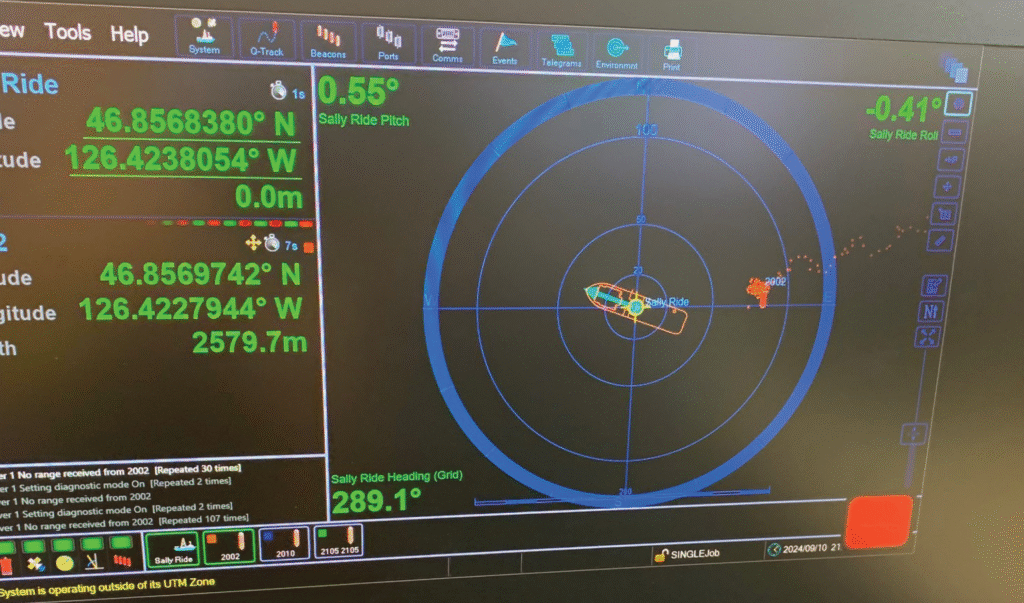 We use a Sonardyne Ranger 2 USBL system for probe locating and real-time telemetry. The Ranger 2 system acoustically transmits probe position (with error <2% of slant range, often <1%) and subset of probe data to monitor probe performance. Knowing the probe position allows greater survey efficiency, allowing the next measurement to begin as soon as the probe is sufficiently close to the ship. This acoustic data link is capable of reliably transmitting data from depths to 6000 meters. The Ranger 2 system is portable and can be configured for use on UNOLS ships.