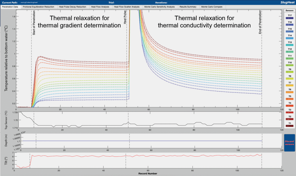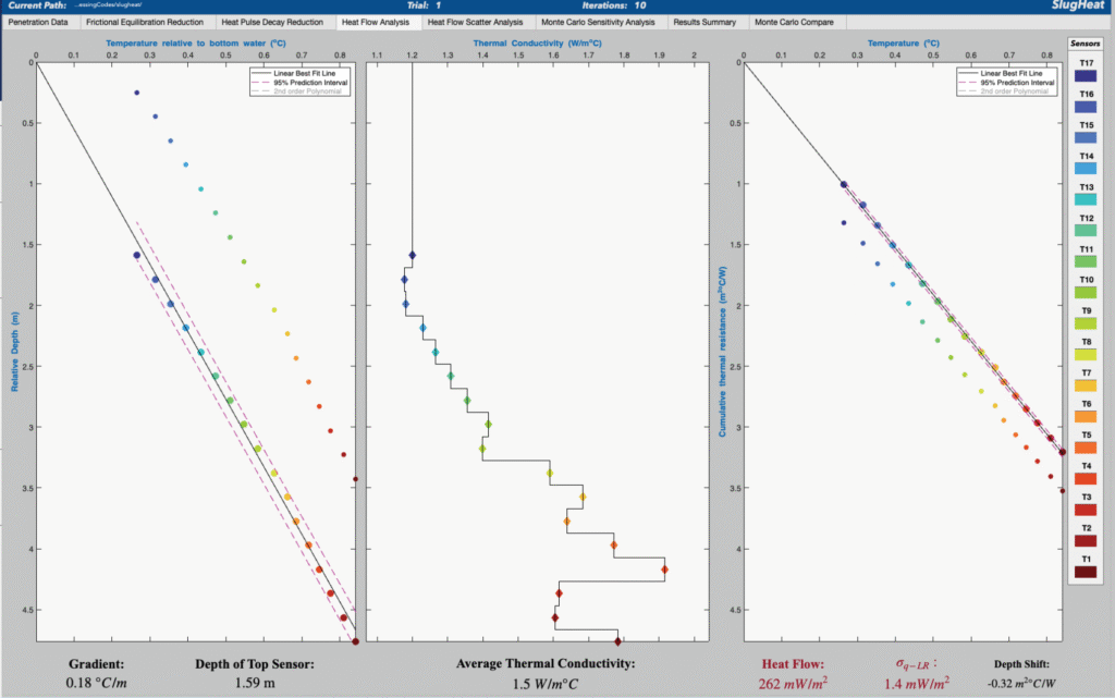 SlugHeat (Dickerson et al., 2024) is a graphically interactive MATLAB program that allows a user to plot, inspect, modify, and process data. The user can account for variations in thermal conductivity with depth, responses from each thermistor, disruptions associated with probe insertion, and sensitivities to unknown parameters, leading to reliable and nuanced heat flow analyses.